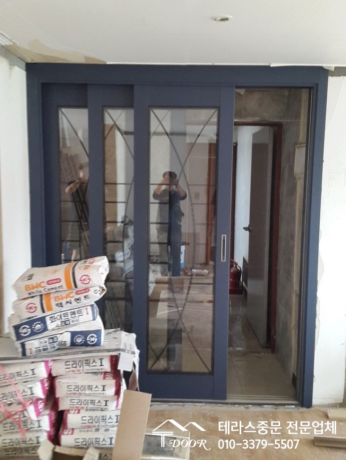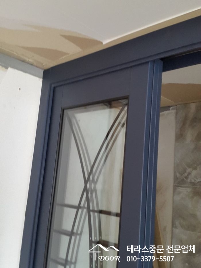 테라스중문 딤 그레이 3연동중문 단조유리 설치 사진입니다.