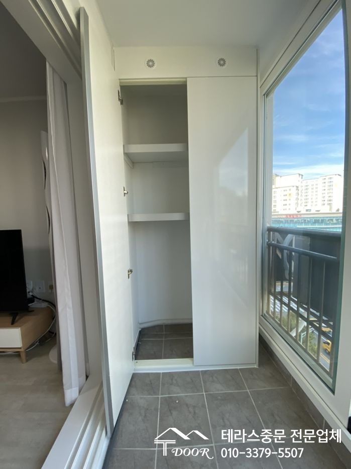 아파트 거실확장 공사 후 틈새 공간 베란다창고문 설치
