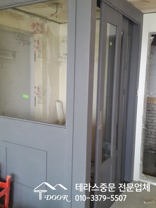 딤 그레이칼라 ㄱ자파티션중문 3연동도어 망입유리 설치 사례입니다.