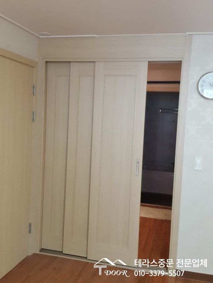 18. 아이보리 화이트펄 우드 3연동도어 망입유리 설치사례입니다..