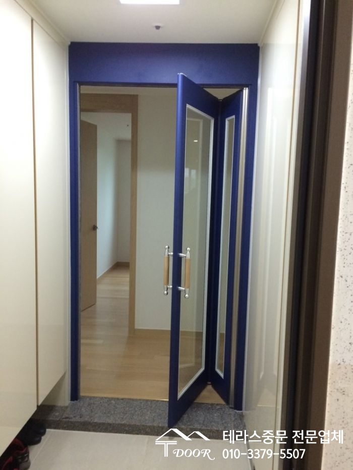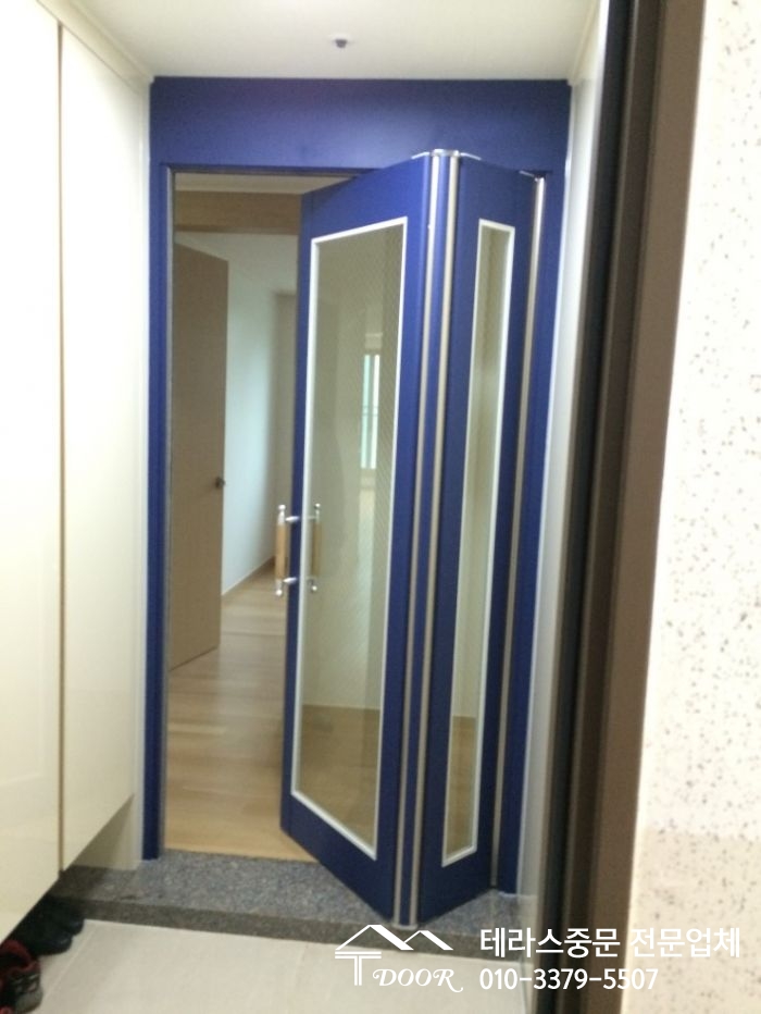 블루칼라 스슁&터닝도어 망입유리 현관중문 시공 사진입니다.