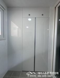 아파트베란다 사이 베란다창고문 LPM 유광화이트로 가벽설치