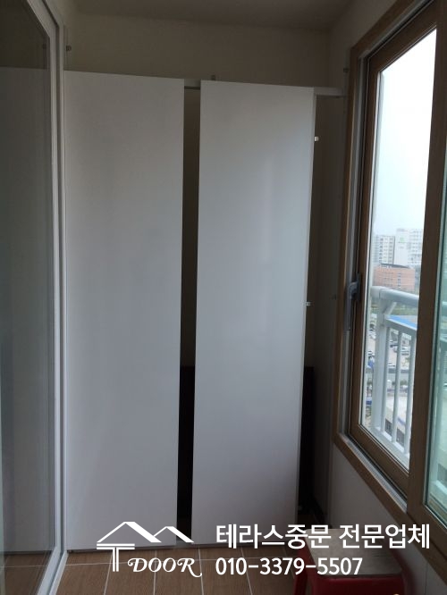 화이트(펄) 쪽양개도어 고시 망입유리 중문설치 사례입니다.